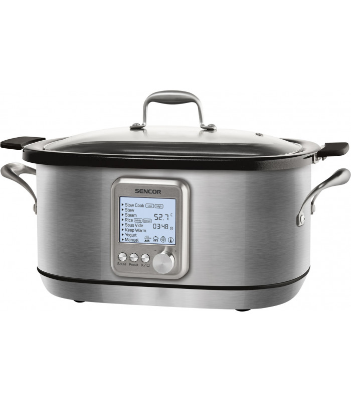 Uključeni sadržaj: Sporo kuhalo s loncem i poklopcem, lonac za kuhanje na pari i rešetka za kuhanje u vakuumu od nehrđajućeg čelika, pladanj za pečenje, kuhinjske rukavice