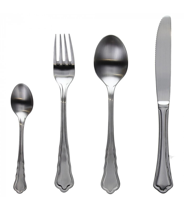 Antony Impero set pribora za jelo sastoji se od 24 komada, za ukupno 6 kompletnih postavki: 6 stolnih žlica, 6 vilica, 6 noževa i 6 žlica za kavu. Svaki pribor za jelo je izdržljiv i kvalitetan, izrađen od nehrđajućeg čelika 18/0 u srebrnoj boji. Uz vintage dizajn, ovi pribor za jelo daju dašak elegancije i profinjenosti vašem stolu, čineći atmosferu profinjenom i otmjenom za mise en place koji će zadiviti vaše goste. Impero pribor za jelo pogodan je za pranje u perilici posuđa, što ne narušava njegov sjaj.